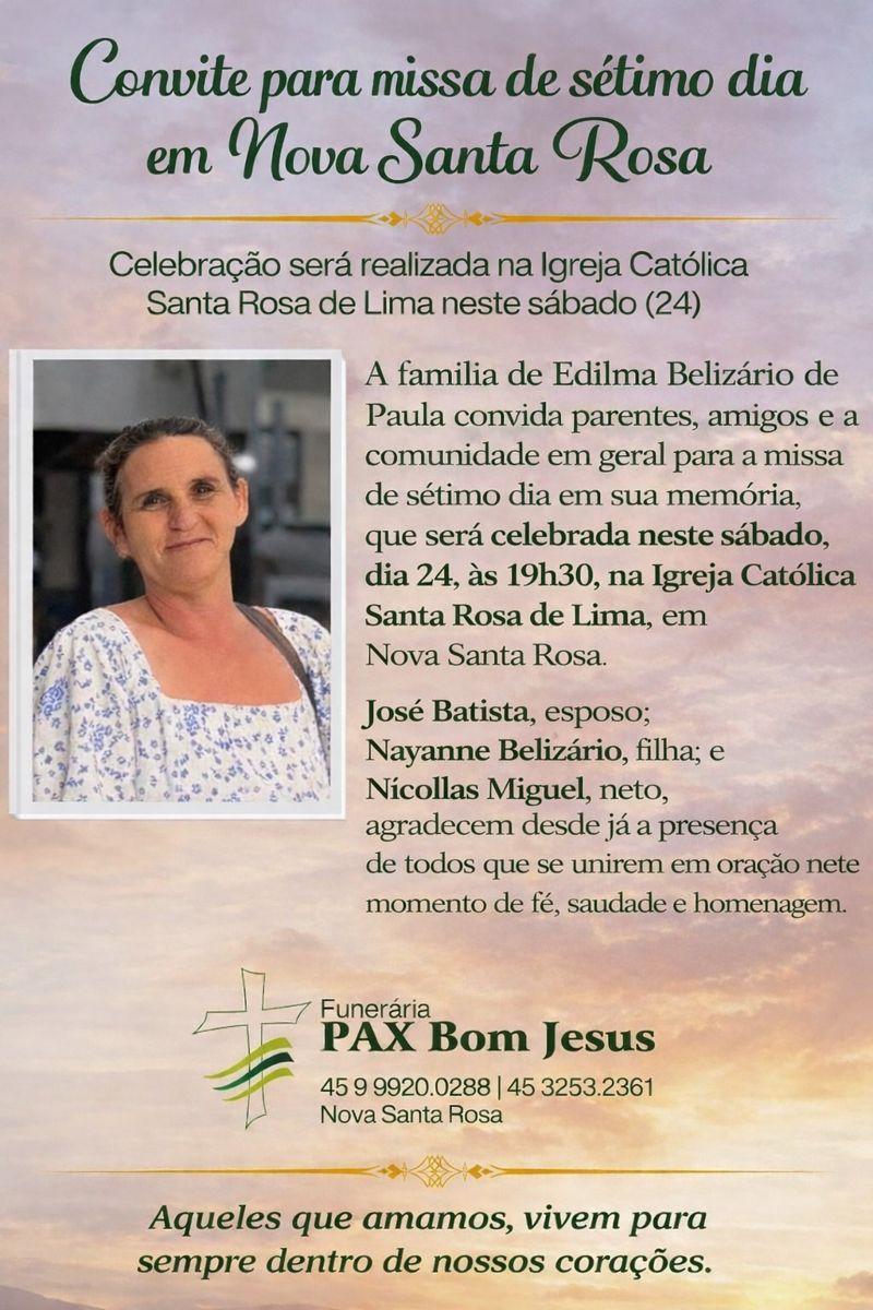 A família de Edilma Belizário de Paula convida parentes, amigos e a comunidade em geral para a missa de sétimo dia em sua memória, que será celebrada neste sábado, dia 23, às 19h30, na Igreja Católica Santa Rosa de Lima, em Nova Santa Rosa.