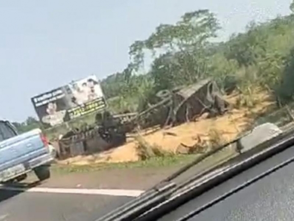 Conforme as informações, a carreta bitrem carregada com soja seguia em sentido Mundo Novo (MS) a Guaíra (PR) e, após uma descida, já próximo a ponte que liga os estados, acabou capotando as margens da rodovia.