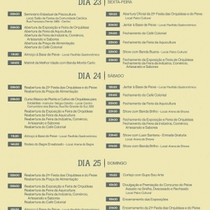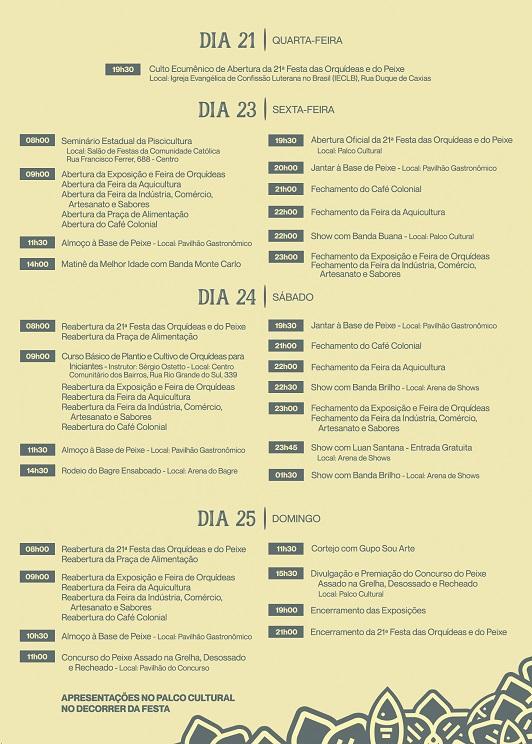 PROGRAMAÇÃO – As atrações tradicionais são o foco da programação, entre elas a exposição e feira de orquídeas, feira da aquicultura, feira da indústria, comércio, artesanato e sabores, café colonial, refeições à base de peixe, praça de alimentação, Seminário Estadual da Piscicultura, Rodeio do Bagre Ensaboado, Matinê da Melhor Idade com a Banda Monte Carlo, Concurso do Peixe Assado na Grelha, Desossado e Recheado e o curso de cultivo de orquídeas. No domingo, dia 25, um cortejo com o Grupo Sou Arte encanta os visitantes.