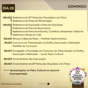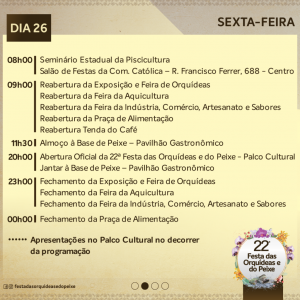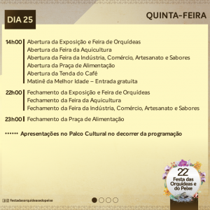 PROGRAMAÇÃO – Nos quatro dias de festa, o público pode visitar a Exposição e Feira de Orquídeas, a Feira da Aquicultura, a Feira da Indústria, Comércio, Artesanato e Sabores, a Tenda do Café, a Praça de Alimentação e atrações no Palco Cultural.