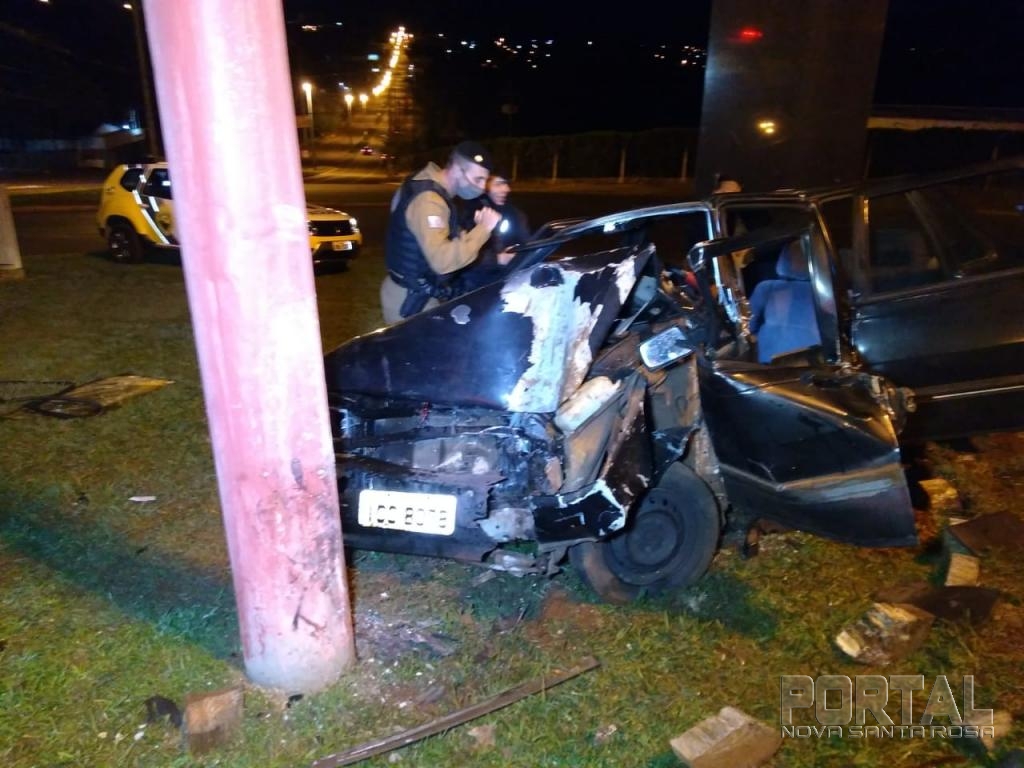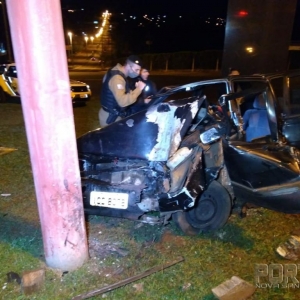 Uma viatura da Polícia Militar que estava próximo fez o acompanhamento tático, com sirene ligada e sinais luminosos, mas, o motorista não acatou a ordem de parada, sendo que ao chegar na rotatória com Avenida Senador Atílio Fontana, o motorista do Fiat, atravessou direto por cima da rotatória e atingiu um poste de iluminação pública.