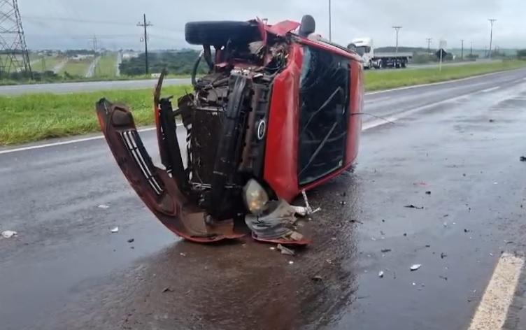 A batida envolveu uma carreta e um Ford Fiesta. Após o impacto, o Fiesta capotou e parou tombado sobre a rodovia.