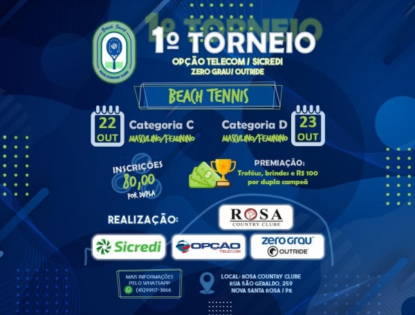 Acontece nesse final de semana, no Rosa Country Clube, o 1° Torneio de Beach Tennis Opção Net/Sicredi/Zero Grau/Outride. Este é, também, o primeiro torneio, dessa nova modalidade de esporte a ser realizado em Nova Santa Rosa.