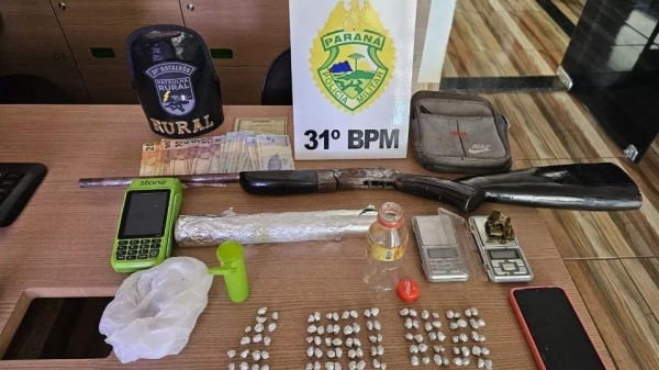 A Polícia Militar estava monitorando o homem e encontraram com ele 99 pedras de crack, uma espingarda calibre .40, quatro porções de maconha, R$ 110,00 reais notas diversas, duas balanças de precisão, celular e uma máquina de cartão.