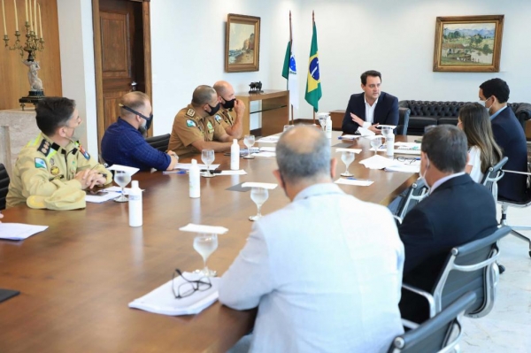 PRESENÇAS – Participaram da reunião o coronel Hudson Leôncio Teixeira, comandante-geral da Polícia Militar do Paraná; o delegado-geral da Polícia Civil, Silvio Jacob Rockembach; o coronel Gerson Gross, comandante do Corpo de Bombeiros; e o coordenador estadual da Defesa Civil, Fernando Schunig.