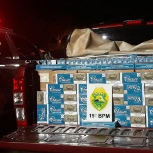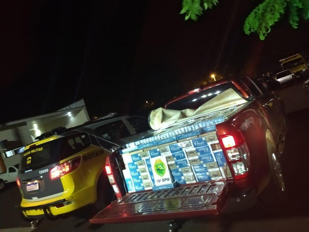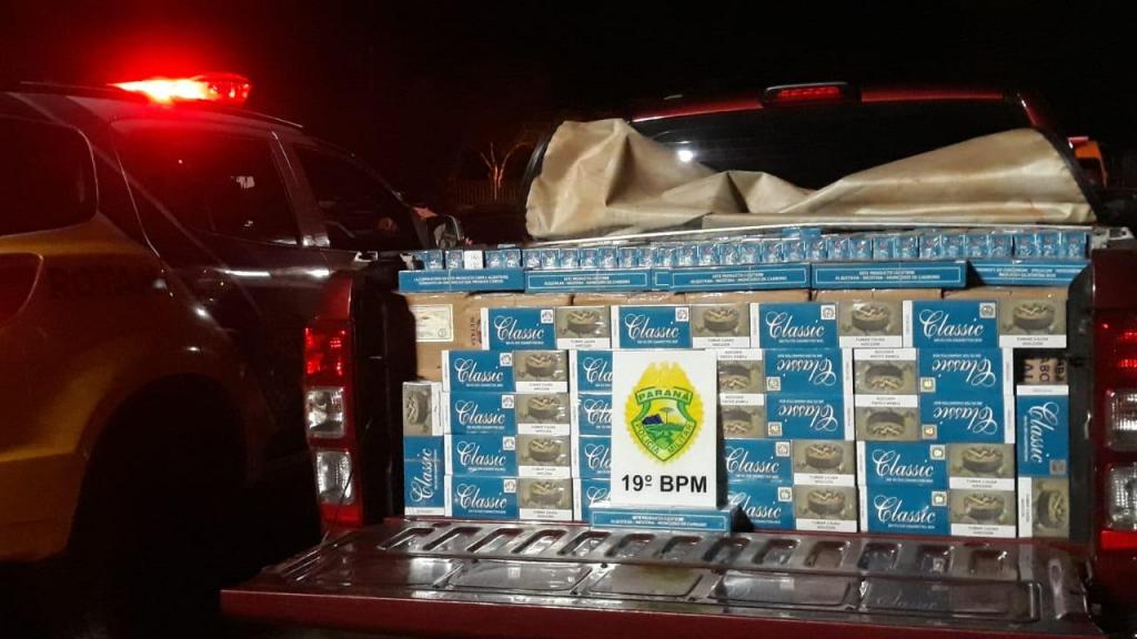 A equipe policial realizou a primeira abordagem e constatou que a caminhonete estava carregada, tanto na carroceria quanto em seu interior com pacotes de cigarro provenientes do Paraguai.