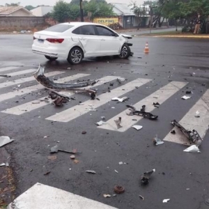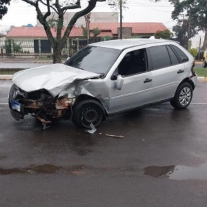 Uma forte colisão envolvendo um VW/Gol e um VW/Jetta foi registrada, nesta quinta-feira (08), no cruzamento da Rua Ministro Gabriel Passos com a Avenida Marcelino Rolon, em Guaíra.