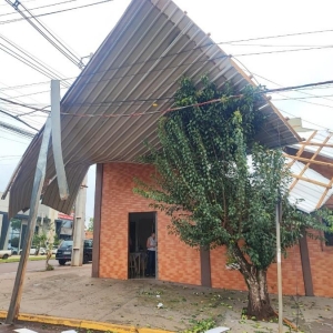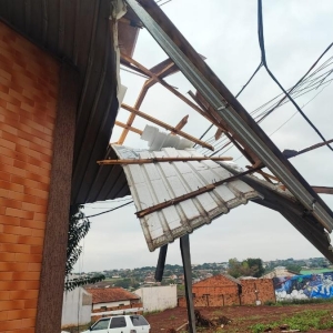 Outra situação parecida foi registrada na Avenida Maripá, no cruzamento com a Rua Riachuelo, região da Vila Operária, onde mais uma estrutura similar foi arrancada e ficou totalmente retorcida. A estrutura foi parar em cima de um hotel e danificou alguns cabos de energia elétrica. Felizmente o prédio não conta com moradores no momento.