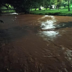 A Sanga Panambi transbordou por cima da pista, alagando aproximadamente 100 metros das duas vias, tumultuando o tráfego de veículos.