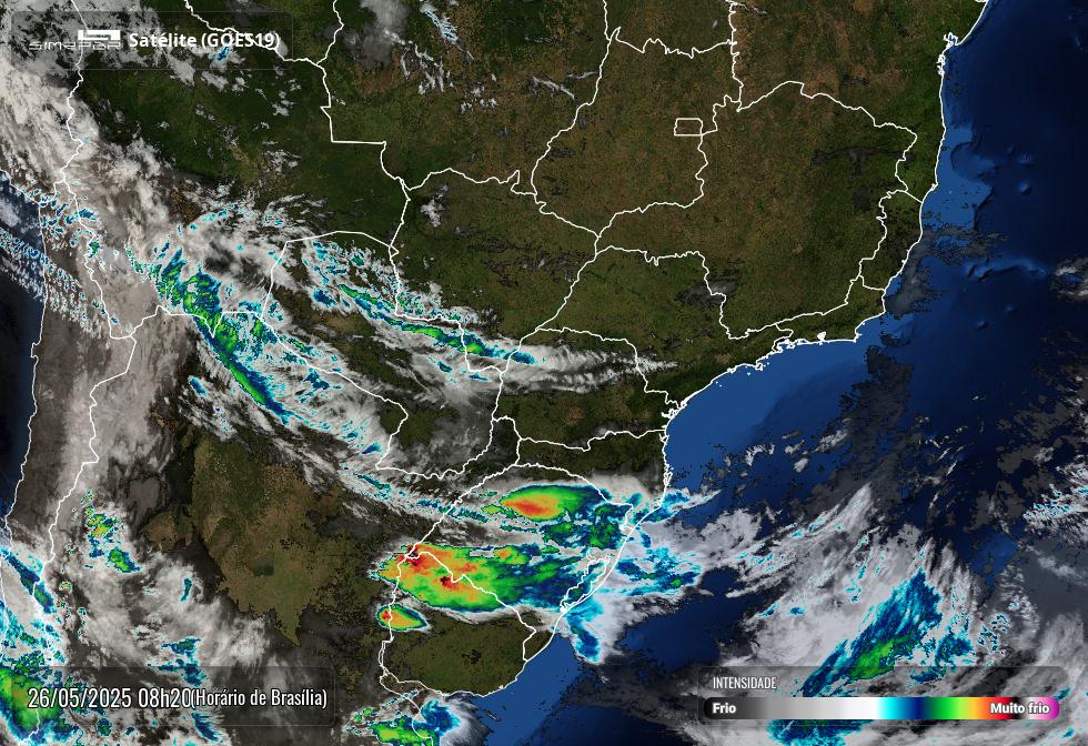 Uma nova frente fria está avançando pelo Sul do Brasil e já começou a mudar o tempo em várias regiões do Paraná. A imagem de satélite capturada às 8h20 desta segunda-feira (26) mostra uma grande área de instabilidade se formando sobre o Rio Grande do Sul, Santa Catarina e avançando com força sobre o Paraná.