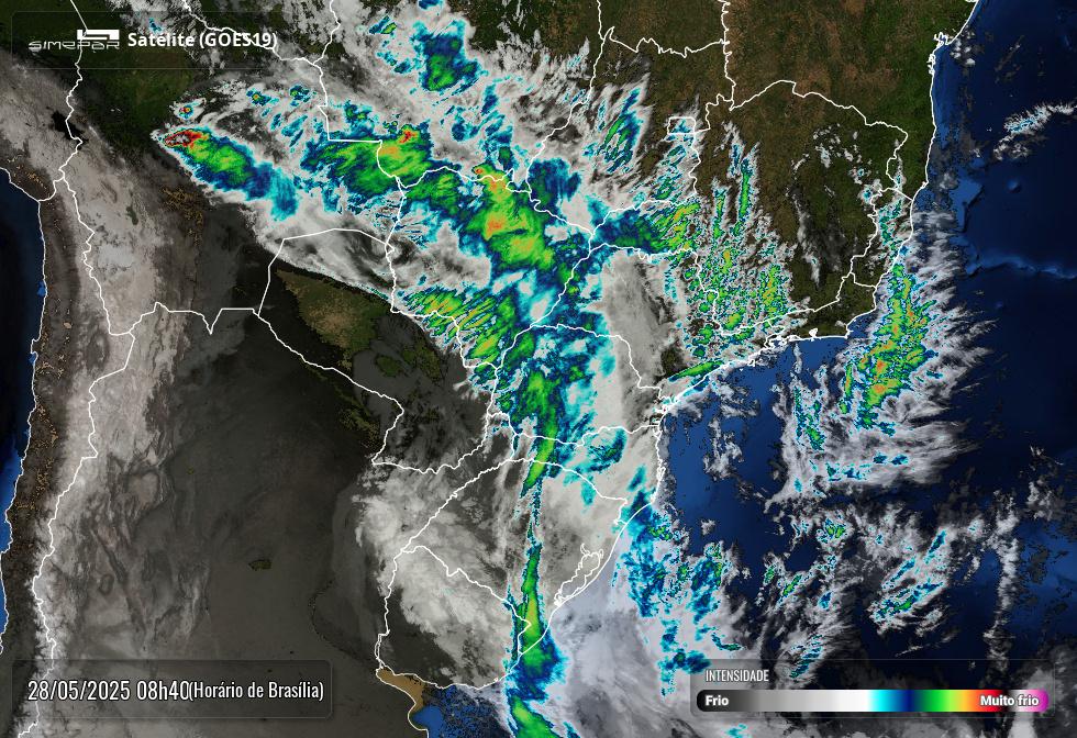 A imagem de satélite divulgada pelo Simepar às 8h40 desta quarta-feira (28) mostra a atuação de uma frente fria sobre o Sul do Brasil, trazendo áreas de instabilidade que se espalham principalmente entre o Mato Grosso do Sul, Paraná, Santa Catarina e Rio Grande do Sul.