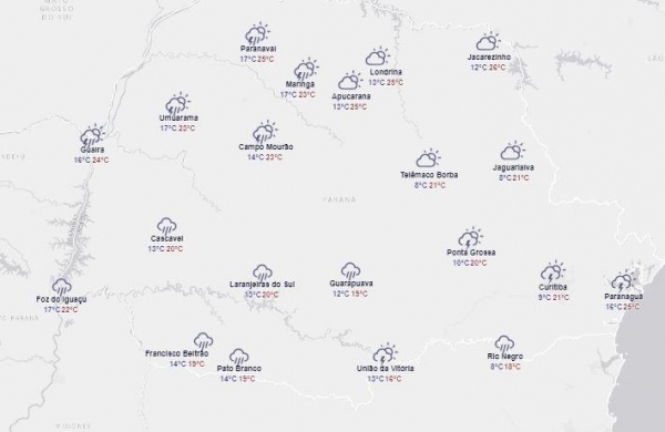 Em Cascavel, a chuva não vai afetar no clima. De acordo com o Simepar, a mínima fica na casa dos 19°C e a máxima pode chegar aos 20°C.