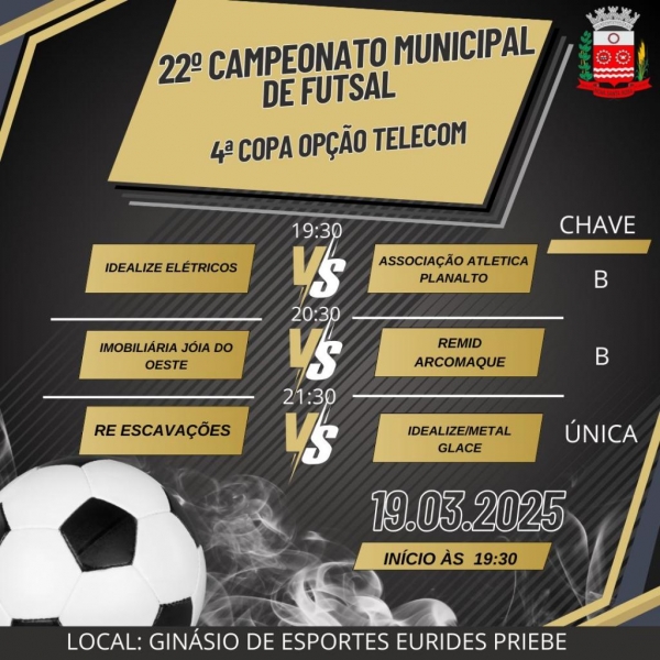 A 4ª Copa Opção Telecom de Futsal, válida pelo Campeonato Municipal, segue com mais três jogos nesta quarta-feira (19), marcando a nona rodada da competição. As partidas serão disputadas no Ginásio de Esportes João Batista Moreira.