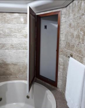 Os armários ficavam escondidos pelos espelhos nos banheiros do casal e de uma suíte de solteiro.