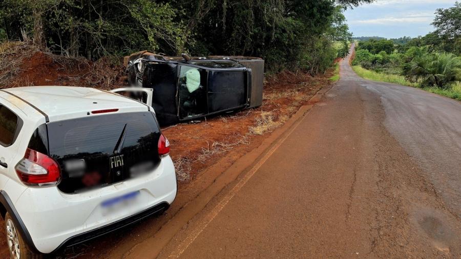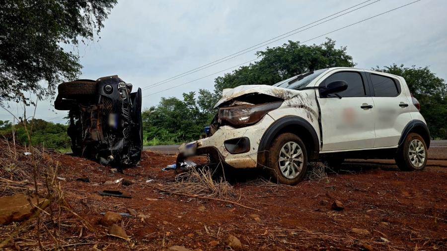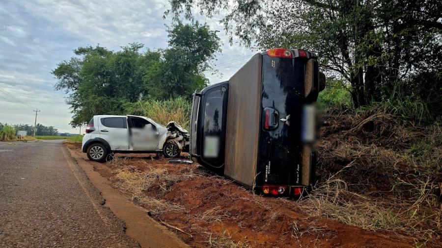 Com o forte impacto, a L200 ficou tombada as margens da rodovia e o Mobi ficou atravessado as margens.