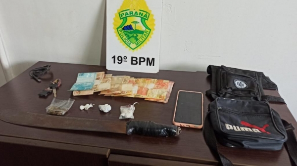 Quando a PM chegou na tarde de ontem (14), através de uma denúncia anônima haviam quatro pessoas no local, dois deles foram abordados, um menor e outro maior de idade com maconha e cocaína que estavam sendo comercializados, inclusive uma moto sem procedência comprovada que possivelmente foi trocada por drogas, um dos elementos disse que comprou ela por mil reais.