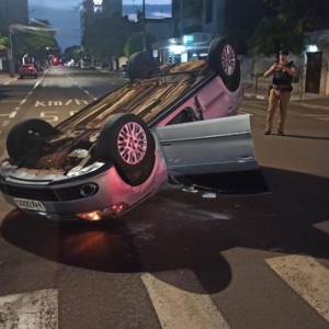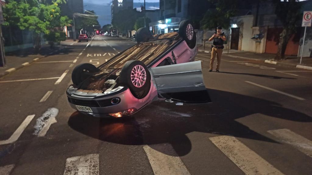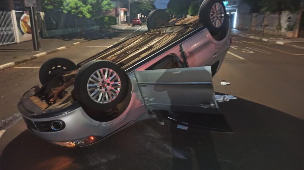 No cruzamento das vias aconteceu a batida e após a colisão o Gol capotou parando com as rodas para cima no meio da via.