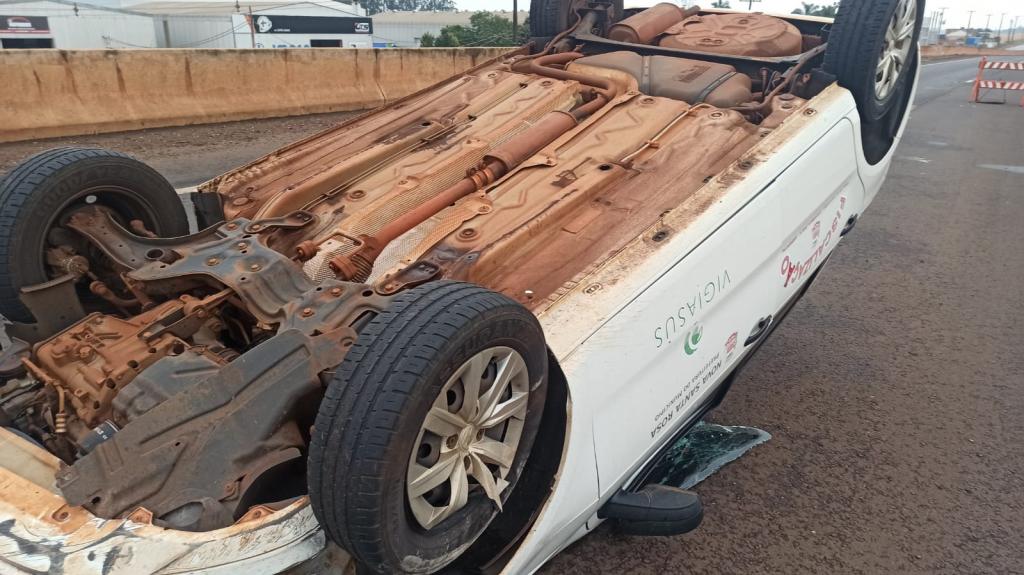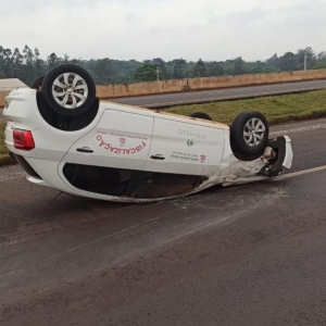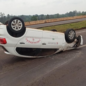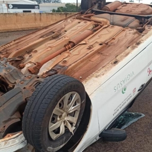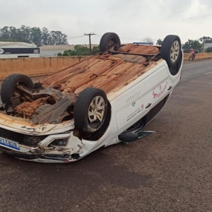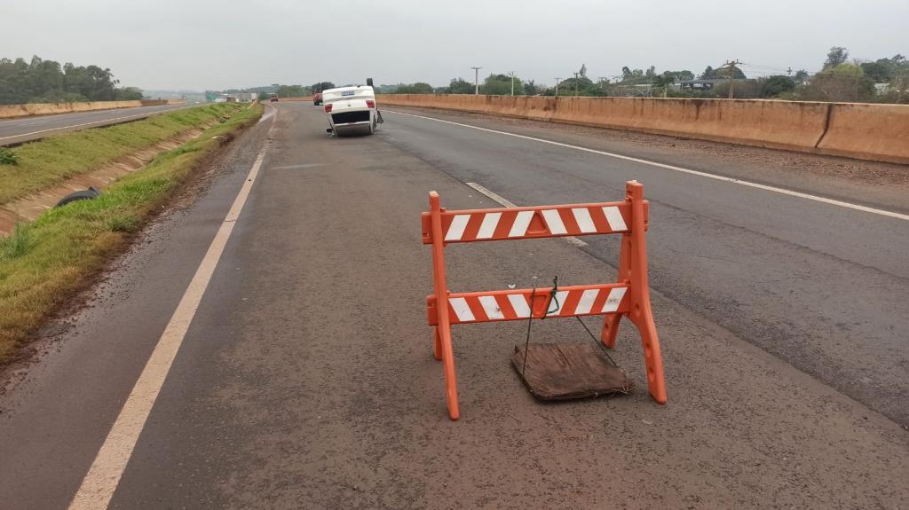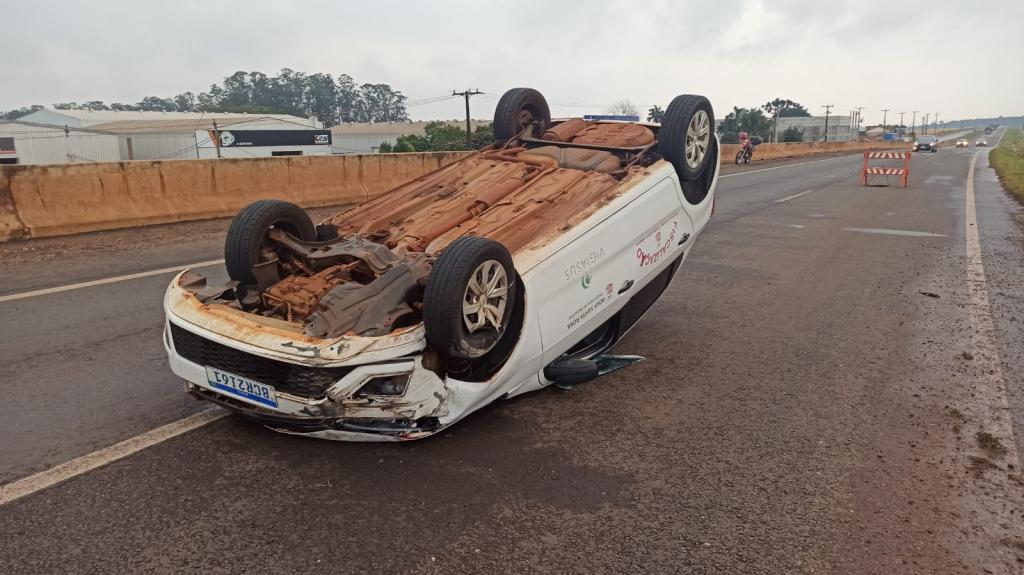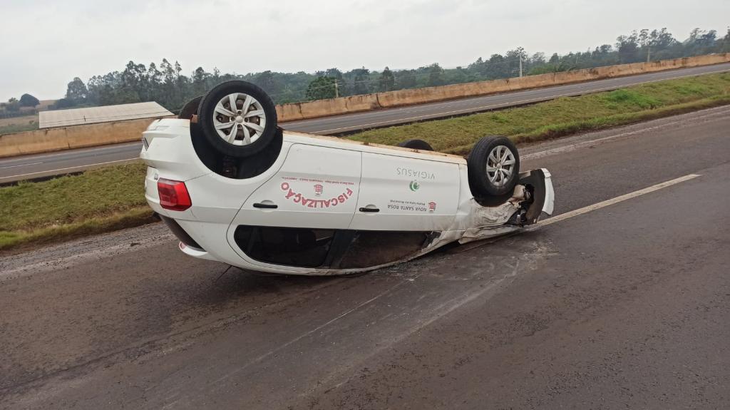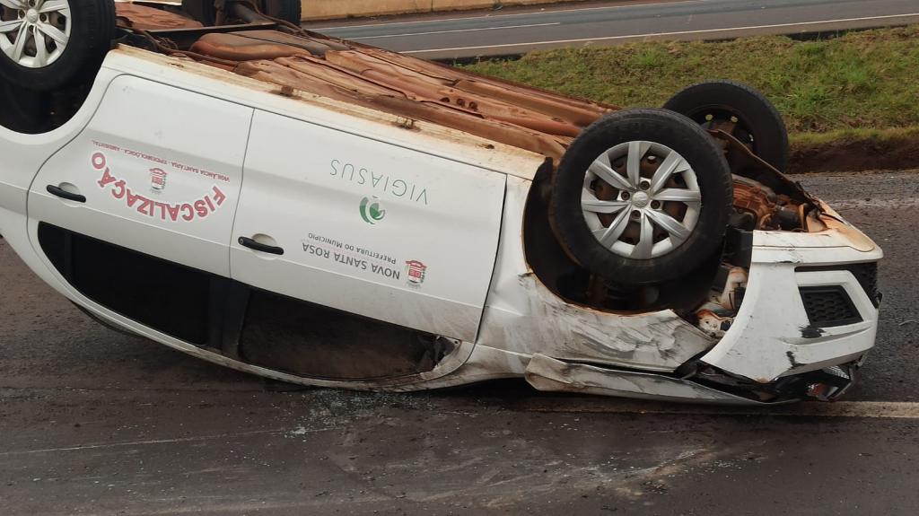 Um veículo da prefeitura municipal de Nova Santa Rosa capotou na tarde desta segunda-feira na rodovia BR-163 na saída de Toledo para Marechal Cândido Rondon em cima do viaduto com a Rua Barão do Rio Branco.