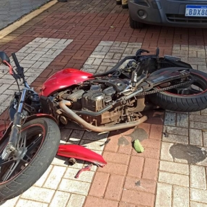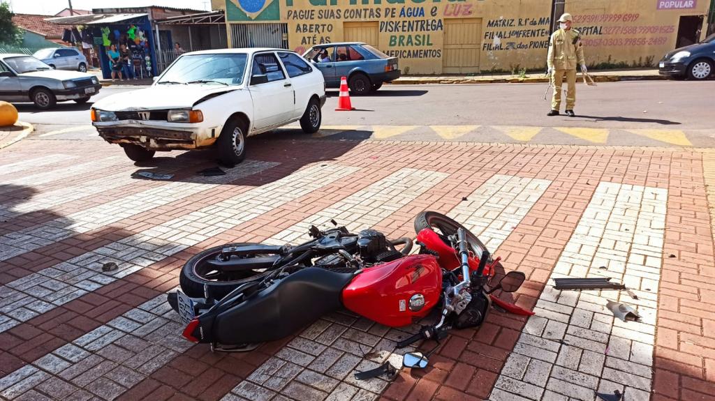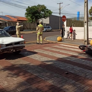 Um acidente entre um carro e uma moto foi registrado no final da manhã desta quinta-feira na rua Tomás de Aquino com rua Doutor Cyro Fernandes do Lago na vila pioneira em Toledo e envolveu um veículo Volkswagen gol com placas de Toledo e uma moto Honda CB 300 com placas Mercosul conduzida por um rapaz de 25 anos.