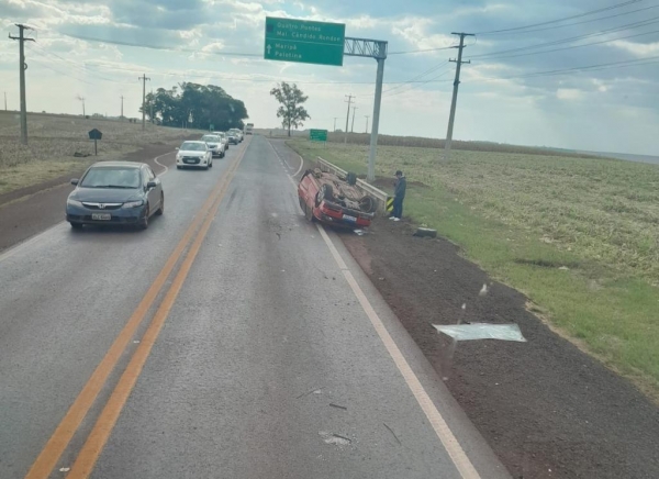 Um veículo Volkswagen Gol tombou na tarde desta sexta-feira (11) na rodovia PR-182, nas proximidades do trevo de acesso ao distrito de Vila Nova, em Toledo, no Oeste do Paraná. O automóvel ficou com as rodas para cima às margens da pista.