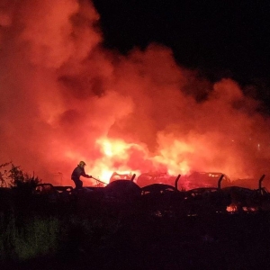 Pelo menos seis caminhões tanque do Corpo de Bombeiros foram mobilizados para o combate de um incêndio de grandes proporções na madrugada desta terça-feira (25), em Cascavel. As chamas atingiram centenas veículos que estavam armazenados no pátio do Detran, na Rua Mawes, no bairro Santo Onofre.