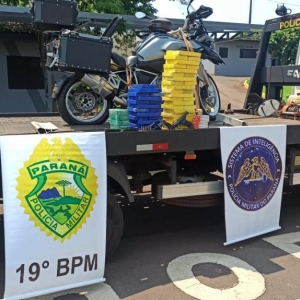 Com o apoio da Polícia Rodoviária Federal e viaturas de Toledo, foi possível abordar o condutor e constatar que o compartimento de bagagens da moto estava carregado com 67 kg de cocaína e 5 kg de crack. Também havia uma pistola calibre 9mm e um revólver calibre 38.