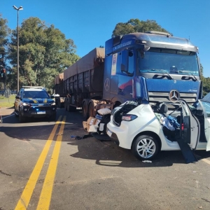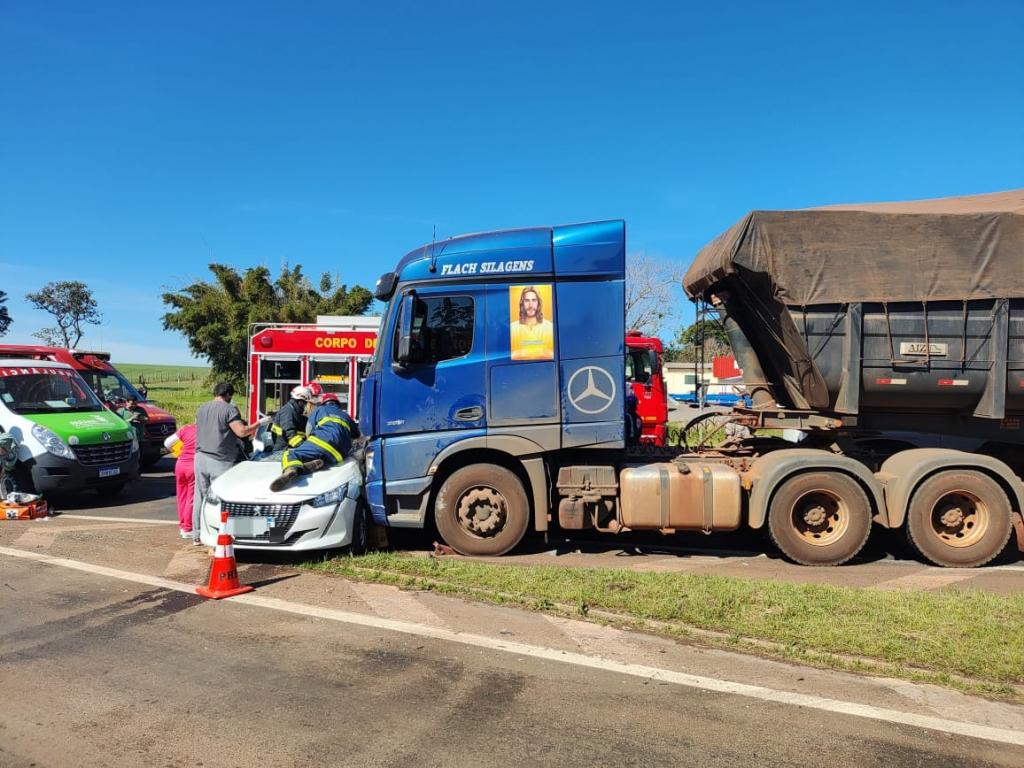 A batida aconteceu quando o carro cruzou a rodovia e foi atingido na lateral pelo bitrem.