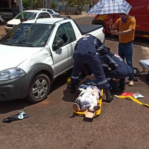 Um homem 45 anos que tinha na garupa da moto sua filha de 19 anos foi lançado contra a lateral esquerda de um veículo Fiat Strada que estava estacionado.