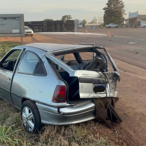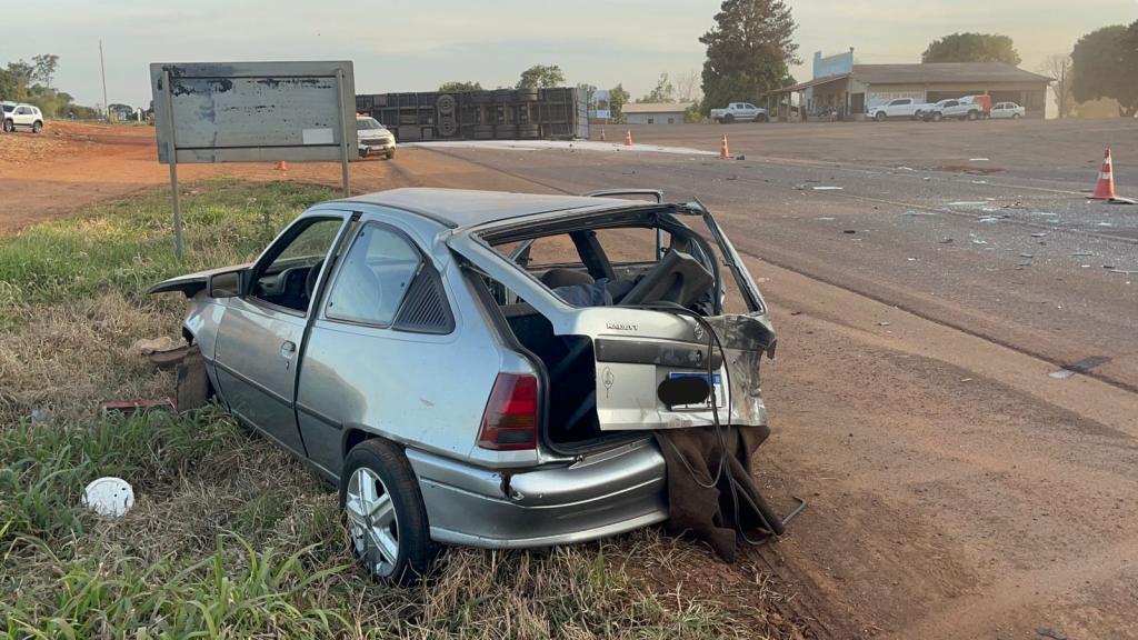 Um grave acidente de trânsito foi registrado por volta das 16h30 deste sábado, dia 2 de agosto, na BR-369, no distrito de Nossa Senhora da Penha, em Corbélia, região Oeste do Paraná. A colisão envolveu um Chevrolet Kadett e uma carreta carregada com amido de mandioca, que acabou tombando e interditando totalmente a rodovia.