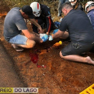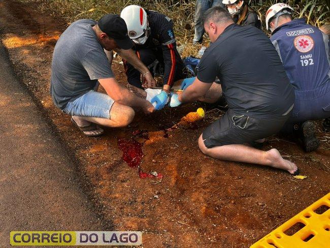 O impacto deixou o motociclista com um ferimento grave na perna, com significativo sangramento no local do acidente. O Serviço de Atendimento Móvel de Urgência (SAMU) foi acionado, realizou os primeiros socorros e conseguiu estabilizar o sangramento antes de encaminhá-lo ao Hospital Beneficente.