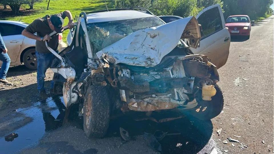 Com o impacto, a carreta graneleira foi jogada para cima do trator, estourando o pneu traseiro do veículo. O automóvel ficou completamente destruído.