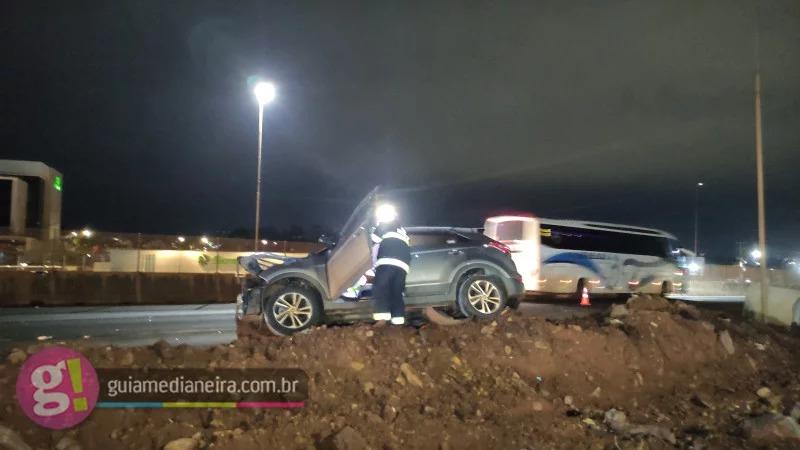 Após a colisão, o Hyundai Creta atingiu a mureta lateral na saída da alça de acesso, capotou por alguns metros e parou sobre um barranco ao lado da rodovia, a cerca de 150 metros do local do impacto.