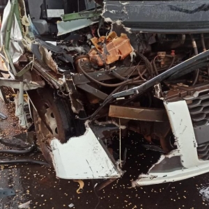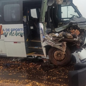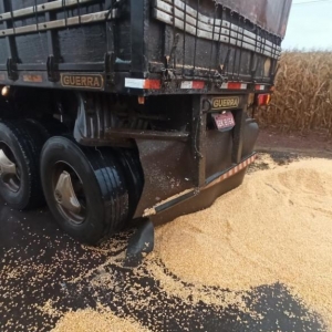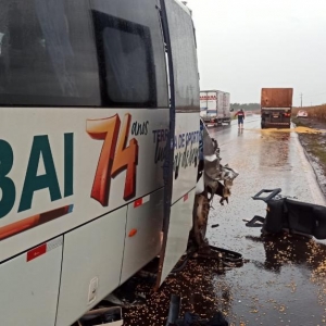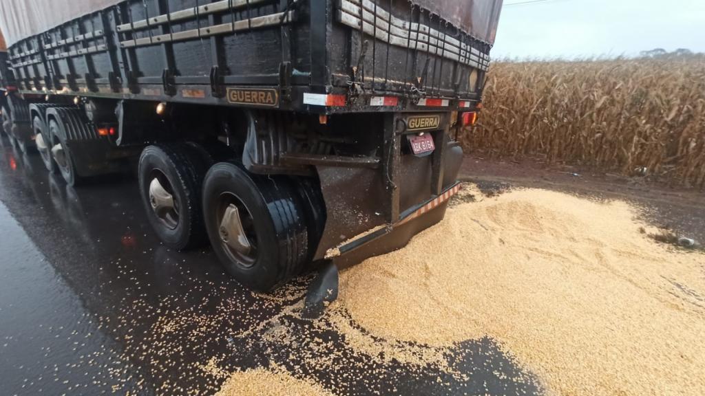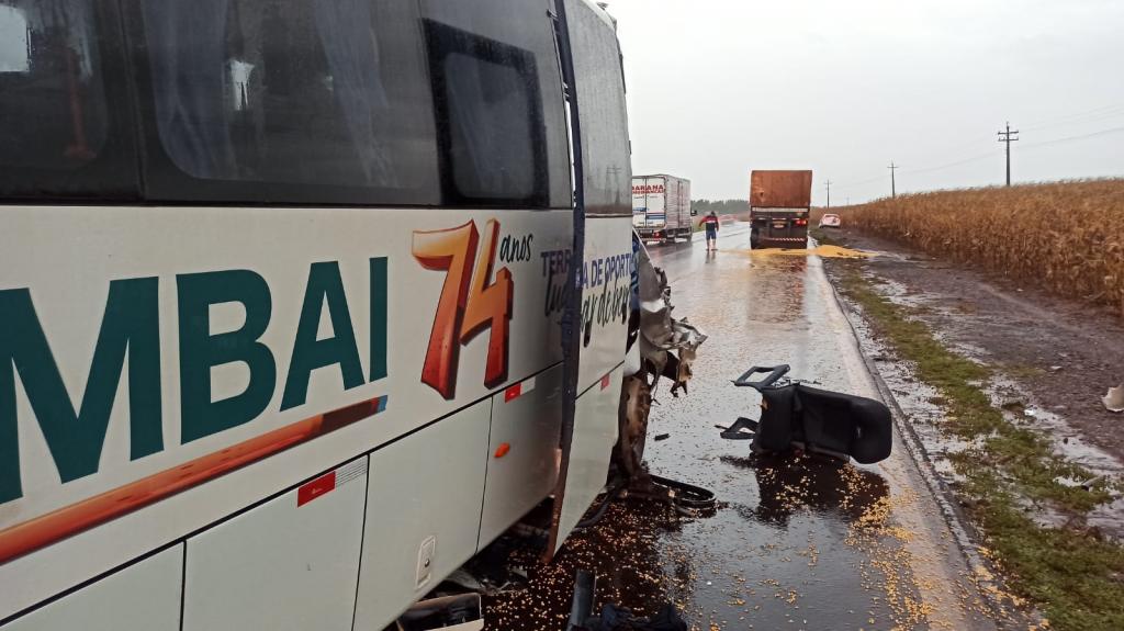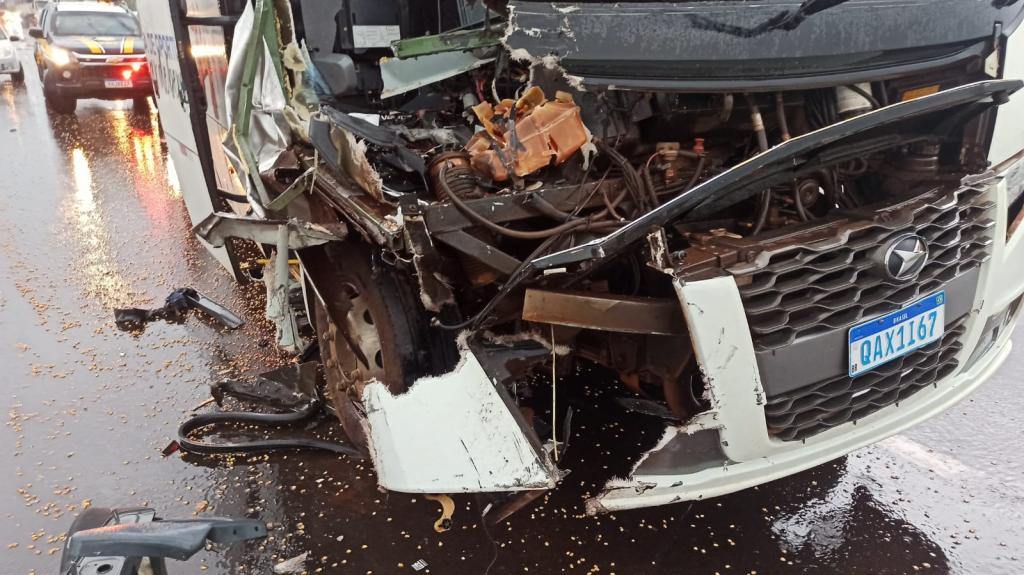 Com o impacto da batida, a parte da frente do coletivo teve diversos danos. Já na parte de trás da carreta ficou danificada e houve derramamento de parte da carga de milho.