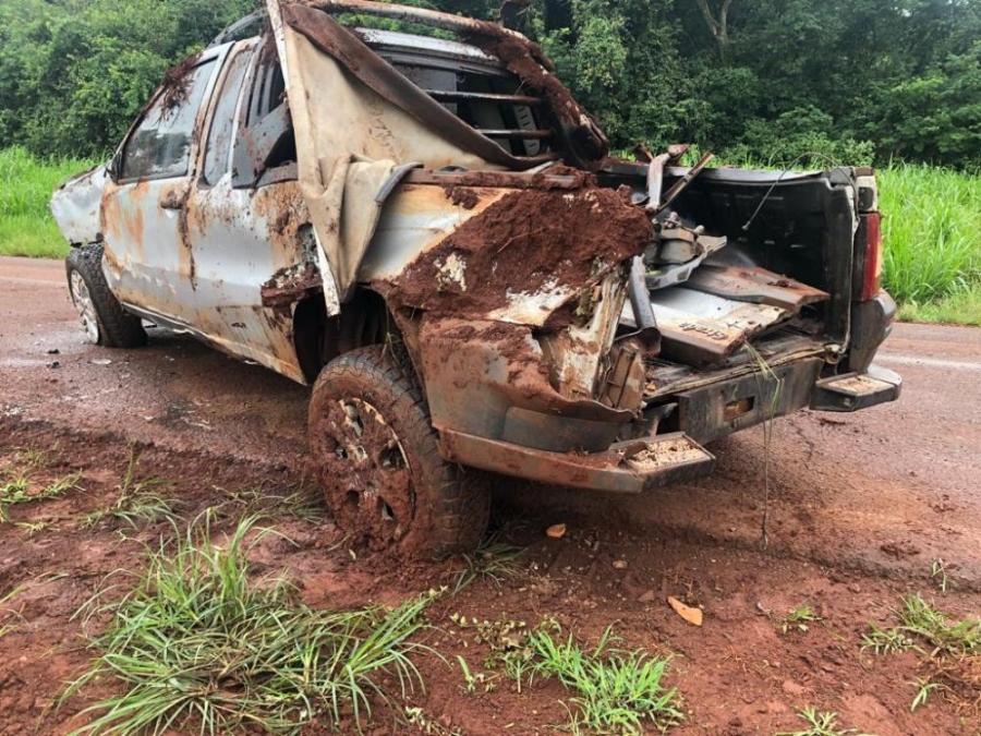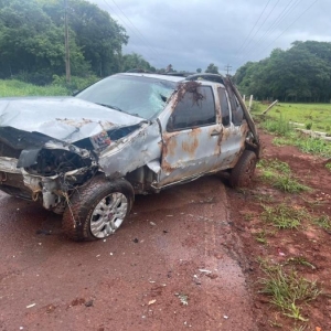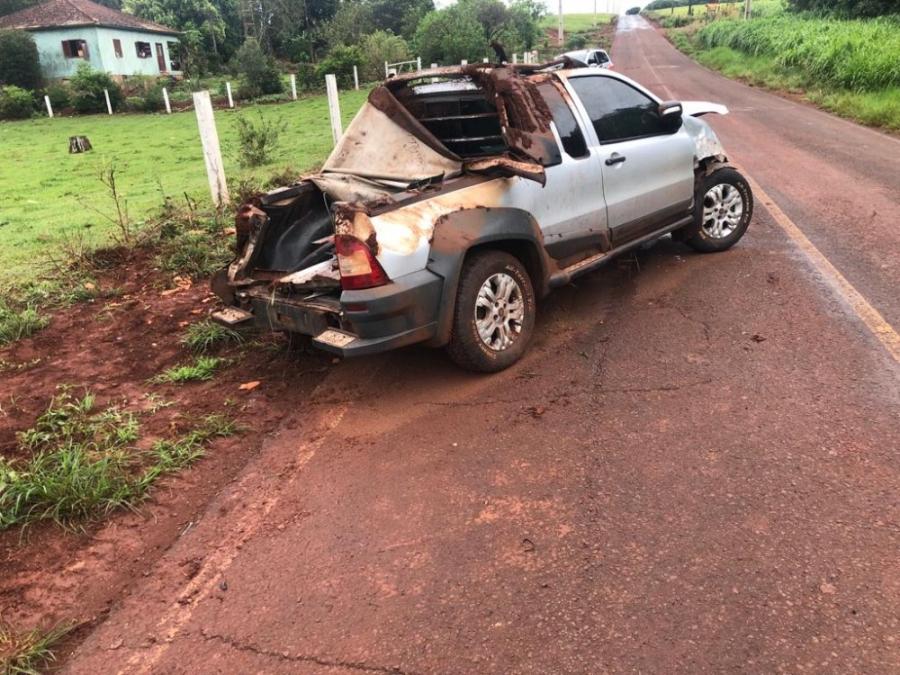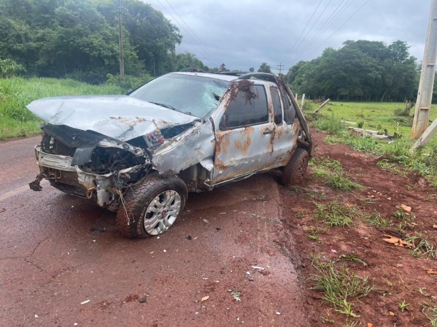 O condutor de uma pick-up Fiat Strada, placas Mercosul, trafegava no sentido a sede municipal e numa reta perdeu o controle da direção, saiu da pista, colidiu contra uma cerca e o veículo capotou algumas vezes.