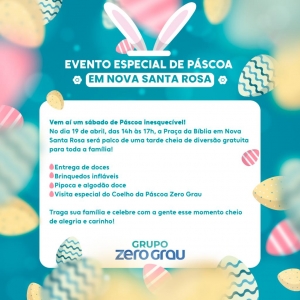 Neste sábado, 19 de abril, a Praça da Bíblia, em Nova Santa Rosa, será o ponto de encontro para uma tarde incrível voltada especialmente às crianças. O Grupo Zero Grau organiza um evento gratuito e cheio de atividades para celebrar a magia da Páscoa com muita alegria.