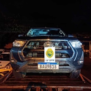 Em vistoria os PMs constataram que a caminhonete Toyota/Hilux CD SRV A4FD, cor cinza, estava com placas falsas, sendo as verdadeiras RHB0E80, emplacada na cidade de Marialva/PR e com alerta de furto/roubo no dia 6 de maio.