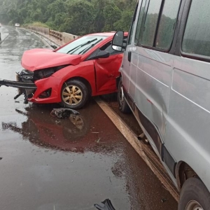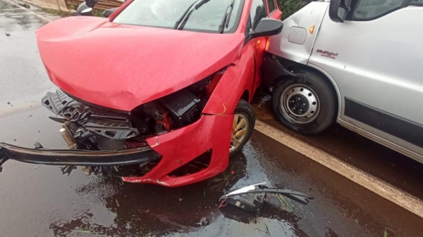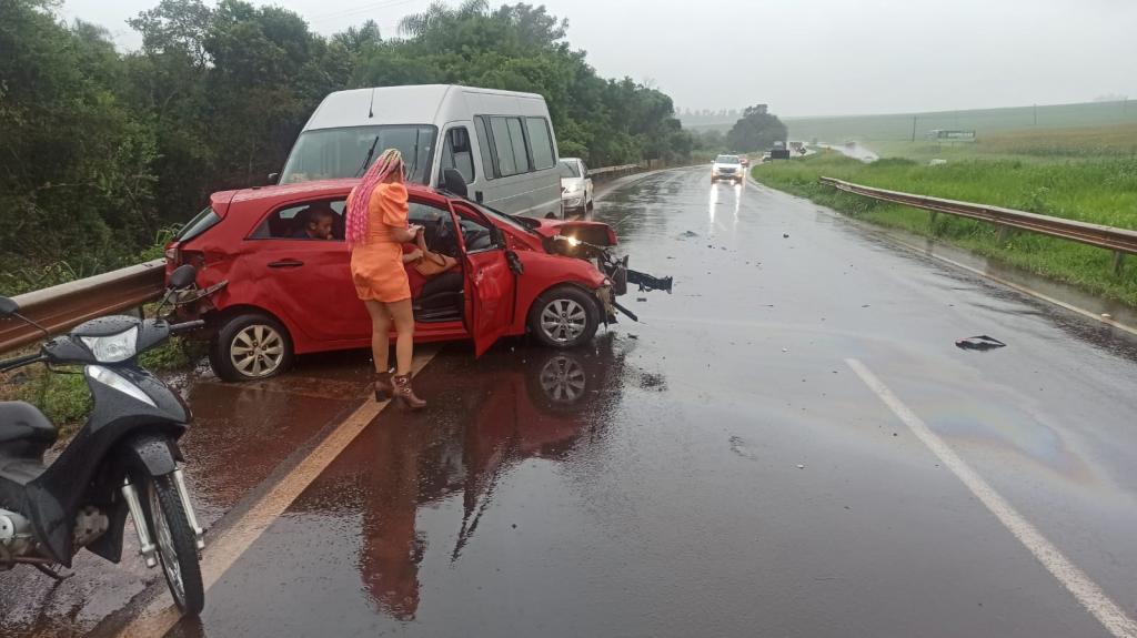 Um veículo Hyundai HB20 com placas de Santa Tereza do Oeste conduzido por uma mulher que tinha como passageiros duas crianças e uma idosa colidiu contra o anteparo na BR 163 na ponte sobre o Rio lopeí, divisa do município de Toledo e Cascavel por volta das 16h30 deste domingo. A pista estava milhada no momento da colisão.