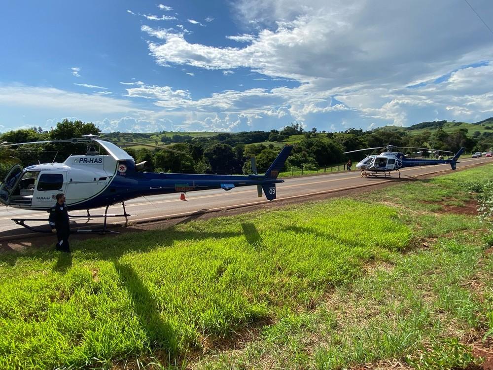 Dois helicópteros do Serviço de Atendimento Móvel de Urgência (Samu) foram acionados para atender um acidente entre uma carreta e uma ambulância que levava uma grávida em trabalho de parto, na tarde desta sexta-feira (2), na PR-170, em Nova Itacolomi, no norte do Paraná.