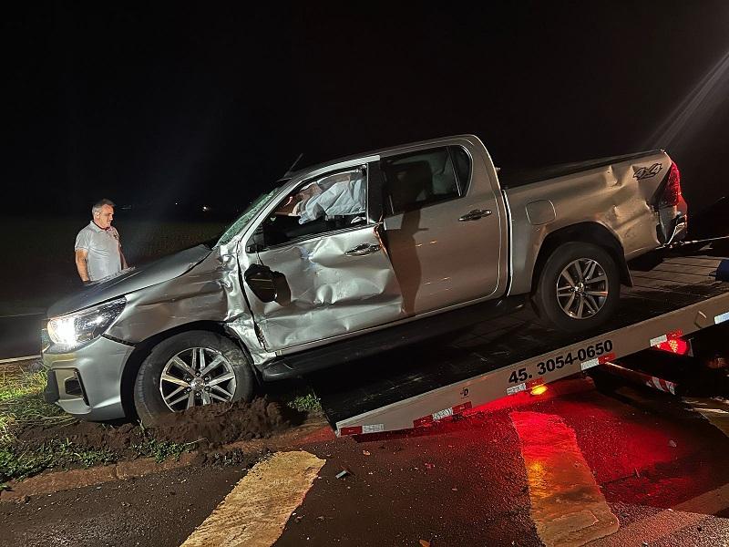 Um acidente na PR 182 no trevo de Maripá deixou uma caminhonete Hilux com placas Mercosul em cima de um dos canteiros do trevo no final da noite desta sexta-feira.