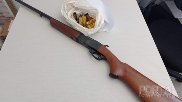 Dando continuidade nas buscas dentro do veículo e embaixo do banco traseiro foi localizado uma espingarda calibre 20 e uma sacola contendo 12 cartuchos intacto e oito deflagrado.