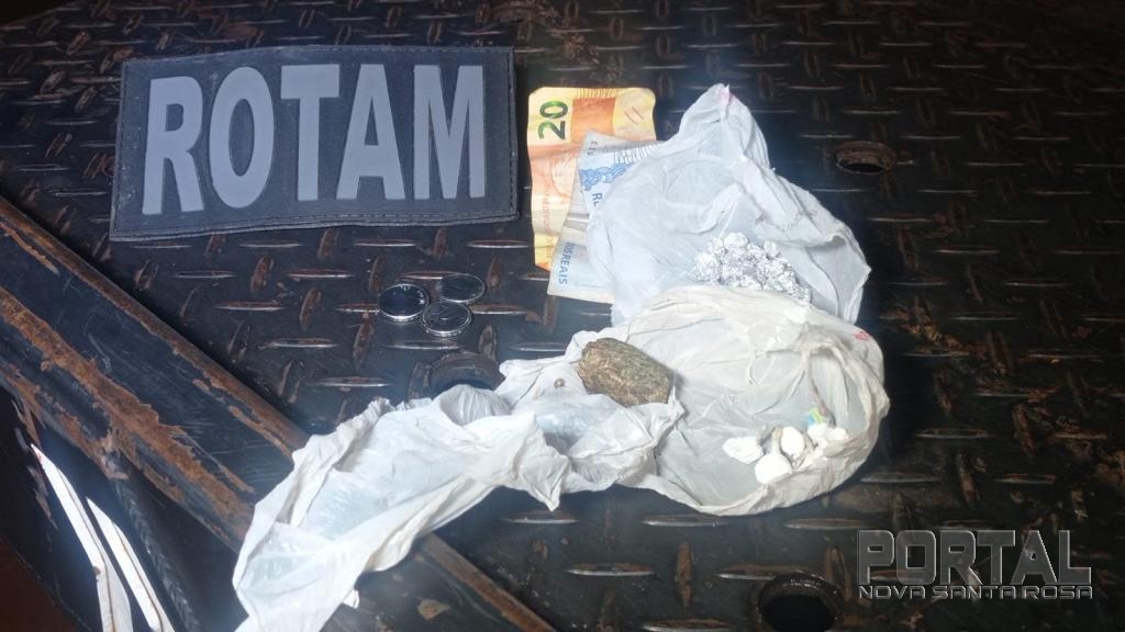 Foi realizada a abordagem do suspeito, posteriormente identificado, que se apresentou como responsável pelo estabelecimento. em revista pessoal ao indivíduo, foi localizado no bolso dos shorts três (03) invólucros plásticos, contendo em um deles 28 (vinte e oito) pedras de crack, que após pesagem totalizaram 05 (cinco) gramas; em outro invólucro 07 (sete) buchas de substancia análoga a cocaína, que totalizaram 03 (três) gramas e em outro uma porção análoga a maconha, pesando 07 (sete) gramas.