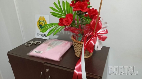 Diante das informações a equipe da PM se deslocou ao local onde reside o autor, onde foi encontrado um vaso contendo flores artificiais e também o conjunto de roupa feminina na cor rosa de posso do suspeito, não sendo possível localizar a coroa de flores conforme dito pela vítima.