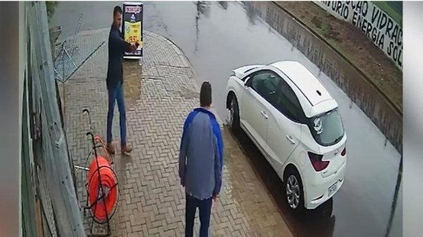 Nas imagens é possível ver o momento que o criminoso sai de um estabelecimento, mira contra a vítima e atira contra ele. Na sequência o homem cai na calçada, enquanto o atirador sai correndo.