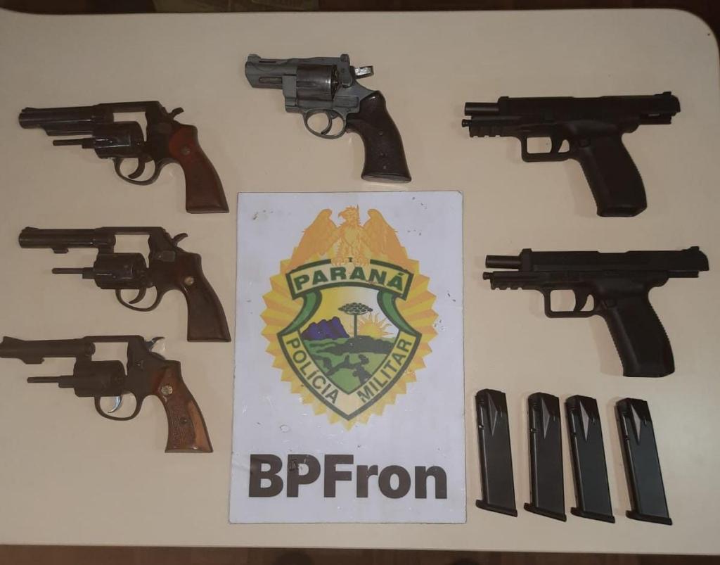 Ao realizar revista no bagageiro, foi localizado uma bolsa contendo seis armas de fogo sendo; dois revólveres marca Taurus calibre .38, um revólver marca Indumil llama calibre .38, um revólver marca Custer calibre .38, e duas pistolas marca Canik Tp9sf com dois carregadores cada.