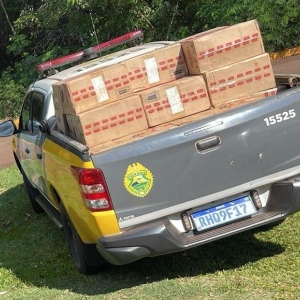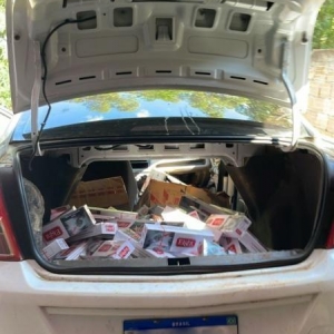 Ainda em diligências, a Polícia Militar foi até a residência, onde visualizou várias caixas de cigarros na garagem. Ao todo, foram apreendidas 24 caixas do produto contrabandeado do Paraguai.