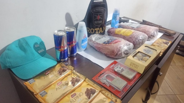 O abordado estava com uma bicicleta e relatou que a nota do veículo estava na casa dele. Em contato com a namorada do suspeito, ela afirmou que não tinha nota da bicicleta e informou que o homem já tinha chegado em casa com três peças de picanha, quatro barras de chocolate da nestlê, além de diversos outros produtos que foram furtados anteriormente em um mercado. Um simulacro de arma de fogo também foi encontrado.