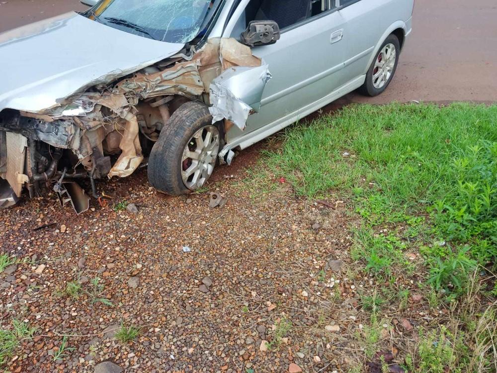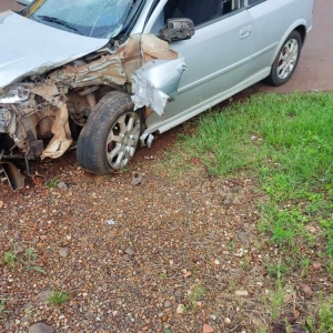 No acidente envolveu um Astra de prata e um caminhão.
