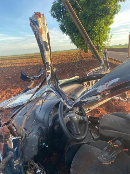 O carro ficou completamente destruído no acidente. Equipes do Corpo de Bombeiros, Polícia Militar e Guarda Municipal também estiveram no local.