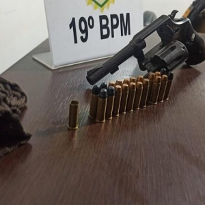 Questionado novamente, o suspeito acabou revelando que havia escondido um revólver calibre .38, da marca Taurus, em um terreno baldio ao lado da casa. A arma estava carregada com cinco munições intactas e uma picotada, além de uma meia contendo mais 15 munições — entre elas, uma deflagrada e seis picotadas.