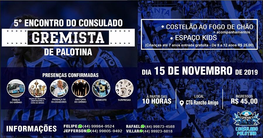 Palotina - O Consulado do Grêmio estará realizando na sexta-feira, dia 15 de novembro, feriado, o 5º Encontro do Consulado Gremista de Palotina. O evento acontecerá no CTG Rancho Amigo, com um almoço de confraternização e diversas atrações.
